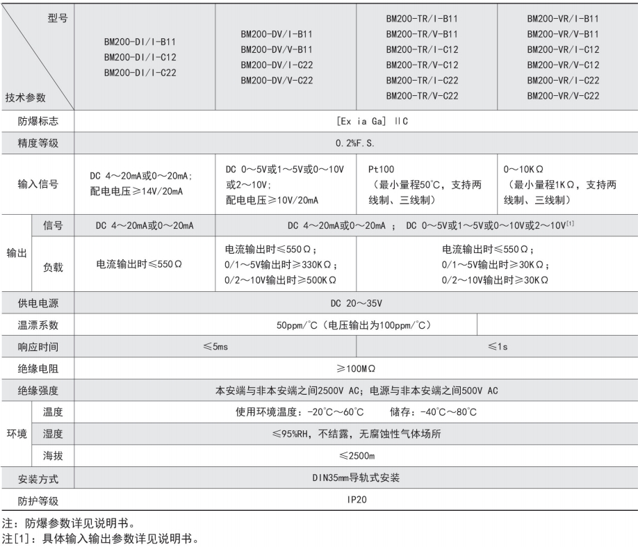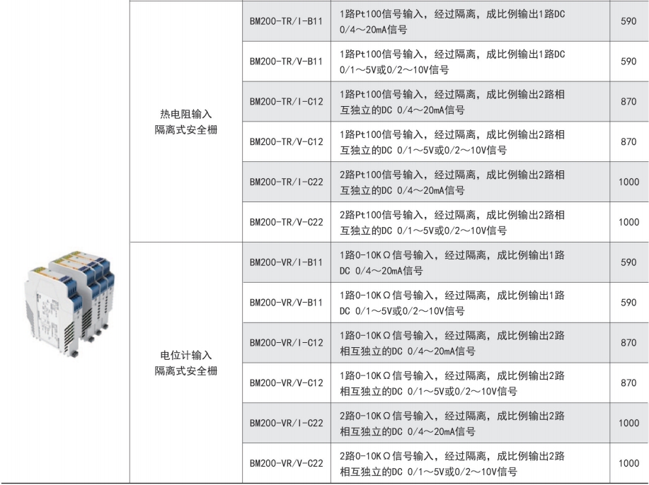 BM200系列隔離式安全柵能在安全區(qū)和危險(xiǎn)區(qū)之間傳遞信號(hào),并限制因故障引起的安全區(qū)向危險(xiǎn)區(qū)的能量轉(zhuǎn)遞,危險(xiǎn)側(cè)設(shè)備(變送器)產(chǎn)生的電壓、電流、溫度、電阻信號(hào)隔離轉(zhuǎn)換成對(duì)應(yīng)的線性電壓、電流信號(hào)輸出至安全區(qū),該產(chǎn)品需獨(dú)立供電,輸入/輸出/電源三隔離??捎迷陔娏髟?、二線制、三線制變送器設(shè)備。