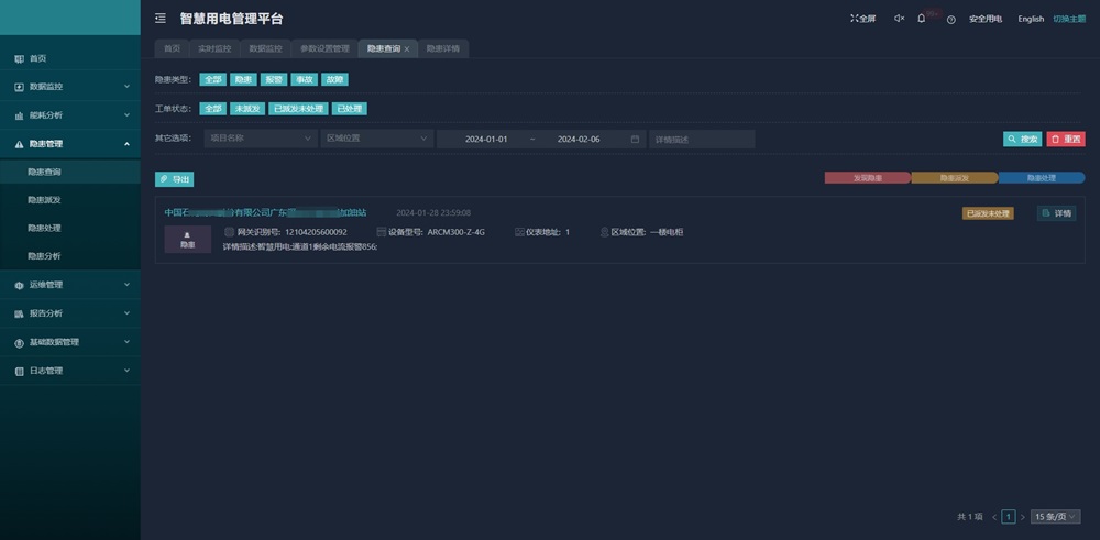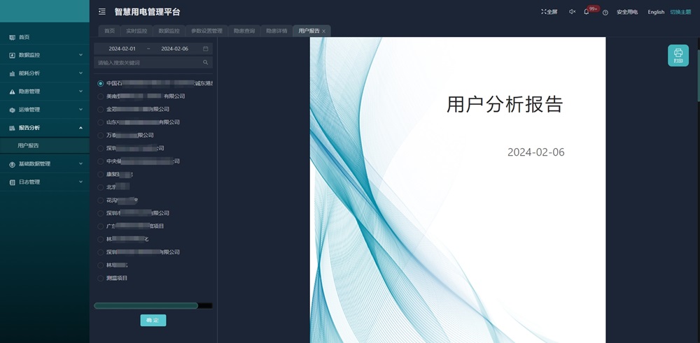 平臺(tái)進(jìn)行大數(shù)據(jù)分析,生成對(duì)應(yīng)項(xiàng)目的用戶報(bào)告,為領(lǐng)導(dǎo)制定電氣安全整頓計(jì)劃和能耗節(jié)約方案提供依據(jù)和參考。