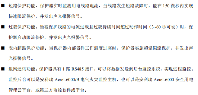 ASCP電氣防火限流式保護(hù)器可有效克服傳統(tǒng)斷路器、空氣開關(guān)和監(jiān)控設(shè)備存在的短路電流大、切斷短路電流時(shí)間長、短路時(shí)產(chǎn)生的電弧火花大,以及使用壽命短等弊端,發(fā)生短路故障時(shí),能以微秒級(jí)速度快速限制短路電流以實(shí)現(xiàn)滅弧保護(hù),從而能顯著減少電氣火災(zāi)事故,保障使用場所人員和財(cái)產(chǎn)的安全。可廣泛應(yīng)用于學(xué)校、醫(yī)院、商場、賓館、娛樂場所、寺廟、文物建筑、會(huì)展、住宅、倉庫、幼兒園、老年人建筑、集體宿舍、電動(dòng)車充電站及租賃式商場商鋪、批發(fā)市場、集貿(mào)市場、甲乙丙類危險(xiǎn)品庫房等各種用電場所末端干、支路的線路保護(hù)。