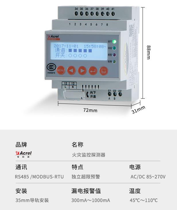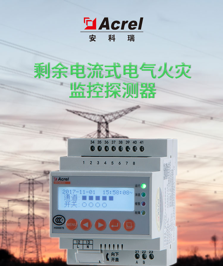智慧用電在線監(jiān)控裝置是針對0.4kV以下的TT、TN系統(tǒng)設(shè)計(jì)的智能電力裝置,具有單、三相交流電測量、四象限電能計(jì)量、諧波分析、開關(guān)量輸入、繼電器輸出功能,以及RS485通訊或GPRS無線通訊功能,通過對配電回路的剩余電流、導(dǎo)線溫度等火災(zāi)危險(xiǎn)參數(shù)實(shí)施監(jiān)控和管理。