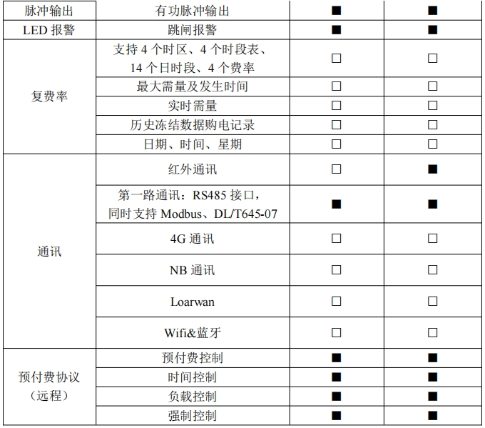 儀表支持預(yù)付費(fèi)功能。可設(shè)置基礎(chǔ)金額,供電表免費(fèi)試用;可對(duì)剩余金額進(jìn)行四級(jí)報(bào)警: 余額不足報(bào)警(一級(jí))、預(yù)跳閘報(bào)警(二級(jí))、欠費(fèi)報(bào)警(三級(jí))、達(dá)到賒欠上限(四級(jí)) 報(bào)警。每級(jí)報(bào)警都會(huì)導(dǎo)致電表背光常亮,預(yù)跳閘報(bào)警跳閘方式可設(shè)置為不跳閘、跳閘后自動(dòng) 合閘以及跳閘后不合閘等,跳閘后可通過(guò)按鍵自行合閘,達(dá)到賒欠上限后電表跳閘,此時(shí)只 有繳費(fèi)后才能繼續(xù)送電使用。