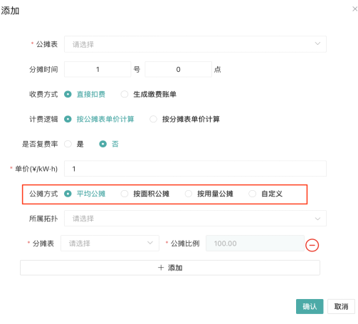 分?jǐn)偡绞街С止潭▎蝺r(jià)、比例分?jǐn)偂⒚娣e分?jǐn)?、用電量分?jǐn)偅?/span>
