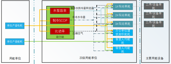 根據(jù)企業(yè)管理架構(gòu)建設(shè)三級計量,接入成品產(chǎn)量/中間產(chǎn)品產(chǎn)量數(shù)據(jù)核算各級單耗數(shù)據(jù),即能源利用效率;對于動力設(shè)備,核算制冷系統(tǒng)能效比,水泵效率等等能源轉(zhuǎn)換效率。