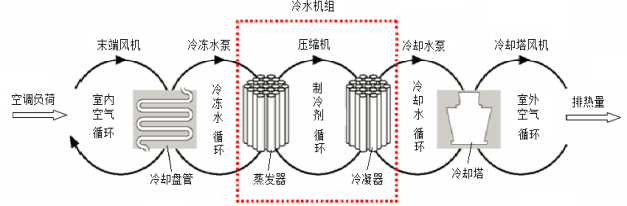 中央空調(diào)系統(tǒng)一般主要由制冷壓縮機、冷凍循環(huán)水設(shè)備、冷卻循環(huán)水設(shè)備、末端風(fēng)機設(shè)備、冷卻塔風(fēng)機設(shè)備等組成。主要通過五大循環(huán),即水泵、風(fēng)機等動力設(shè)備形成一個能量的搬運系統(tǒng),把目標區(qū)域的能量搬運至室外。