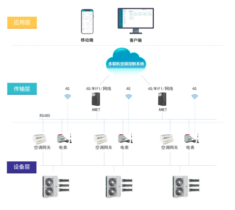 空調(diào)專用網(wǎng)關(guān)對接多聯(lián)機室外機,安裝電表計量電耗。通過Anet實現(xiàn)遠程節(jié)能控制多聯(lián)機室內(nèi)機啟停及計費。