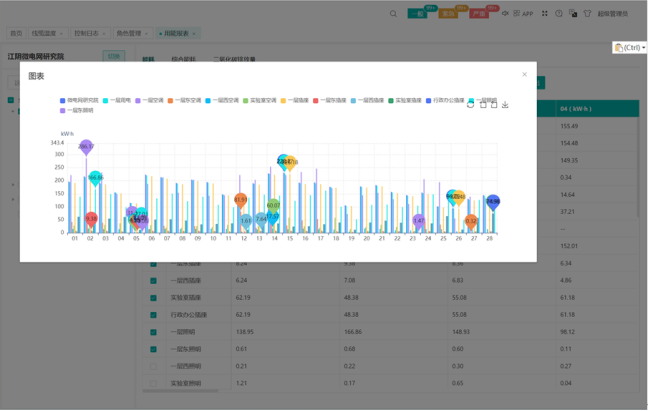 監(jiān)測末端空調(diào)總用電量、單臺空調(diào)用電量等。按建筑、房間拓撲監(jiān)測房間空調(diào)日、月、年用電量。按不同時段,對比查看多個房間用電量。