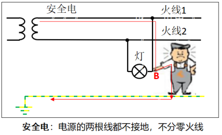 【電不傷人】人站在地上,人體碰到火線(圖中B點(diǎn)),火線1的電流無法經(jīng)人體、大地回到電源端火線2。構(gòu)不成電流回路,不會(huì)有電流流經(jīng)人體,人不會(huì)觸電;