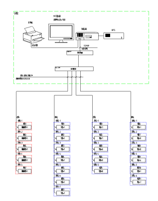 系統(tǒng)通訊結(jié)構(gòu)示意圖,主要顯示系統(tǒng)的組網(wǎng)結(jié)構(gòu),系統(tǒng)采用分層分布式結(jié)構(gòu),同時監(jiān)測間隔層設(shè)備的通信狀態(tài)。紅色表示通訊正常,綠色表示通訊故障。見圖(4)。