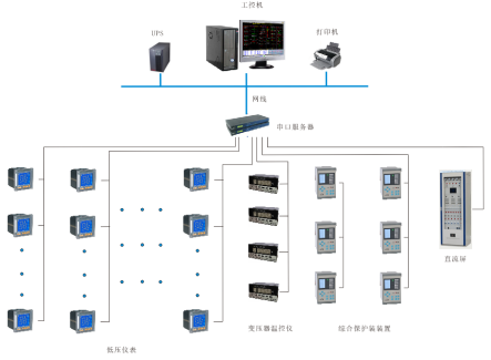本項(xiàng)目共1個(gè)10KV變電站,變電站搭建一套電力監(jiān)控系統(tǒng),放置在35KV變電站值班室內(nèi),變電所內(nèi)部綜保、多功能儀表、溫控儀等設(shè)備通過485接口接入變電站內(nèi)部采集器,再通過采集器傳輸至電力監(jiān)控主機(jī),實(shí)現(xiàn)數(shù)據(jù)在電腦上可視化管理。
