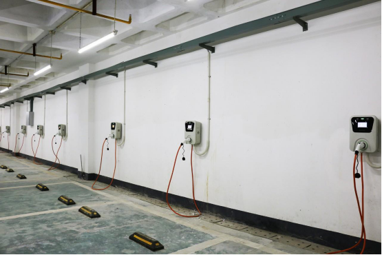 電動車充電樁采用集中安裝的方式,一般安裝于戶外車庫或者地下車庫,如下圖所示