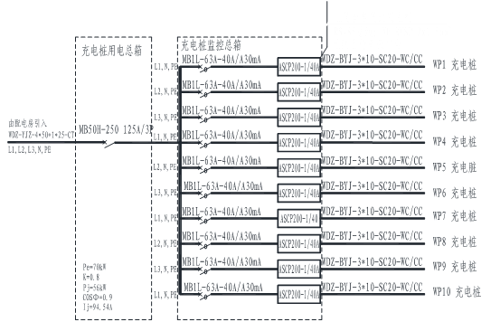 電氣防火限流式保護器在電動車充電樁的圖紙如下圖所示,一般是一個配電回路帶多個出線充電回路。每一個充電樁回路配備一只電氣防火限流式保護器。