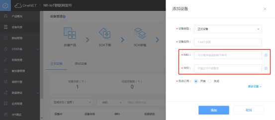 3. 添加設備,添加設備時所用到的IMEI和IMSI號可以在儀表端進行獲取。