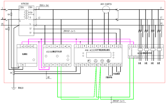 絕緣監(jiān)測(cè)裝置的任務(wù)是監(jiān)測(cè)相線與大地之間的絕緣電阻,當(dāng)阻值低于設(shè)定值時(shí)發(fā)出報(bào)警提示。絕緣監(jiān)測(cè)裝置裝于隔離變壓器二次側(cè)出線與大地之間,在系統(tǒng)中施加測(cè)量電流,當(dāng)系統(tǒng)絕緣電阻下降時(shí),發(fā)出報(bào)警信號(hào)。AIM-M10型絕緣監(jiān)測(cè)儀自帶一路24V直流電源輸出,可為AID150型集中報(bào)警顯示儀供電。