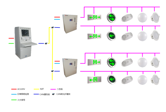 消防應(yīng)急照明與疏散指示系統(tǒng)由控制器(主機(jī))、集中電源和燈具(疏散指示燈具、應(yīng)急照明燈具)等幾部分組成。