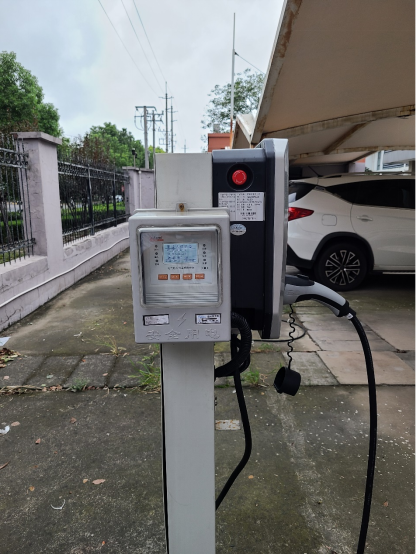 在電動(dòng)汽車汽車充電樁安裝限流式保護(hù)器時(shí)建議采用一充電樁一保護(hù)器的方式,保護(hù)器安裝于充電樁旁邊,如果是戶外,可以將保護(hù)器安裝于防水盒中。實(shí)際安裝如圖所示。