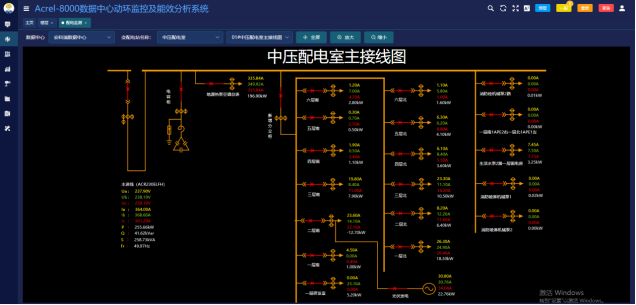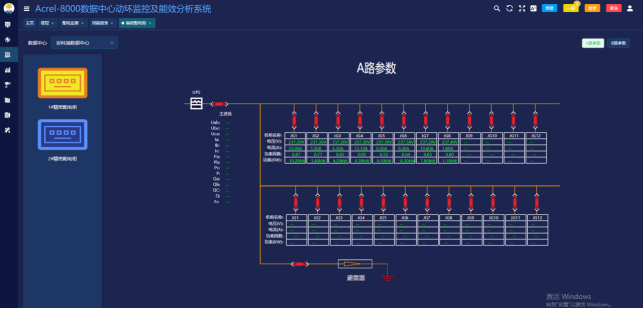 1)配電監(jiān)測可以通過一次圖形式幫助用戶了解每一個機柜的運行情況,數(shù)據(jù)實時刷新。