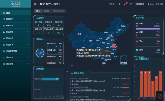首頁展示項(xiàng)目總覽、設(shè)備狀態(tài)、報(bào)警分類及統(tǒng)計(jì)等相關(guān)信息,可直觀了解設(shè)備當(dāng)前的整體情況,并提供各類子菜單頁面的入口。