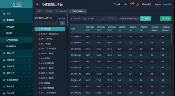 庫區(qū)109臺(tái)機(jī)泵運(yùn)行電流實(shí)時(shí)顯示,能導(dǎo)出單臺(tái)機(jī)泵選定時(shí)間段運(yùn)行電流曲線、數(shù)據(jù)表,也能導(dǎo)出全部機(jī)泵選定時(shí)間段運(yùn)行電流數(shù)據(jù);