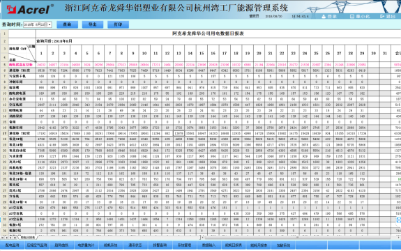 為了實(shí)現(xiàn)對(duì)阿克希龍各用能回路用能量的監(jiān)管,系統(tǒng)設(shè)計(jì)了能源管理報(bào)表,系統(tǒng)通過(guò)對(duì)有功電度、用水、用氣等能源的采集,按照回路名稱的不同。按照計(jì)量體系搭建原則,自動(dòng)生成日?qǐng)?bào)表、月報(bào)表和年報(bào)表,將各進(jìn)線回路與出線回路電能消耗量在同一張報(bào)表中體現(xiàn)出來(lái),并計(jì)算出線回路用電量之和,出線回路與進(jìn)線回路誤差、誤差百分比(誤差百分比是否超標(biāo))等,幫助用戶及時(shí)發(fā)現(xiàn)這種非正常用電問(wèn)題。