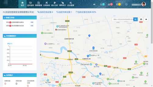 通過(guò)平臺(tái)首頁(yè)可以快速瀏覽隱患巡查界面或隱患處理界面、本月隱患、故障統(tǒng)計(jì)以及項(xiàng)目信息地圖導(dǎo)航,智能調(diào)度技術(shù)人員可以通過(guò)曲線、地圖等各種方式查看隱患數(shù)量、隱患位置、隱患發(fā)生頻率以及任務(wù)的接收、下發(fā)情況,并可以通過(guò)項(xiàng)目列表、地圖快速查定位需要查詢的項(xiàng)目情況。