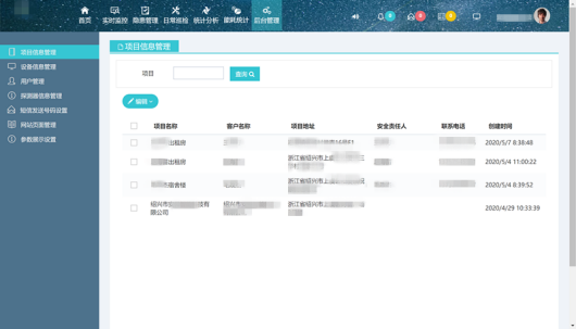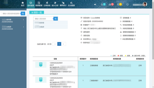 通過(guò)實(shí)時(shí)監(jiān)控界面,除了可以實(shí)時(shí)顯示項(xiàng)目所屬客戶、地址、建筑面積、消防設(shè)施、安全責(zé)任人、聯(lián)系電話、設(shè)備數(shù)量、探測(cè)器數(shù)量等信息,還以更醒目的方式顯示了未處理報(bào)警和未處理故障信息,下屬設(shè)備和探測(cè)器,并可以查看各設(shè)備以及探測(cè)器基本信息、開關(guān)操作、數(shù)據(jù)監(jiān)控、實(shí)時(shí)數(shù)據(jù)、參數(shù)設(shè)置、歷史信息和報(bào)警信息等。