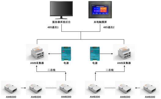 此母線槽紅外測(cè)溫解決方案由人機(jī)HMI觸摸屏,紅外測(cè)溫模塊,紅外采集器,電源模塊組成。該系統(tǒng)通過(guò)RS485線與本地觸摸屏和后臺(tái)監(jiān)控進(jìn)行通信(如下圖),系統(tǒng)設(shè)計(jì)遵循際標(biāo)準(zhǔn)Modbus-RTU傳輸規(guī)約,安全性、可靠性和開(kāi)放性都得到了很大地提高。RS-485作為一種串行通信的接口具有傳輸距離長(zhǎng)、速度較高、電平兼容性好、使用靈活方便、成本低廉和可靠度高等特點(diǎn),與無(wú)線通信方式相比,具有價(jià)格低、抗共模干擾能力強(qiáng)等優(yōu)點(diǎn)。