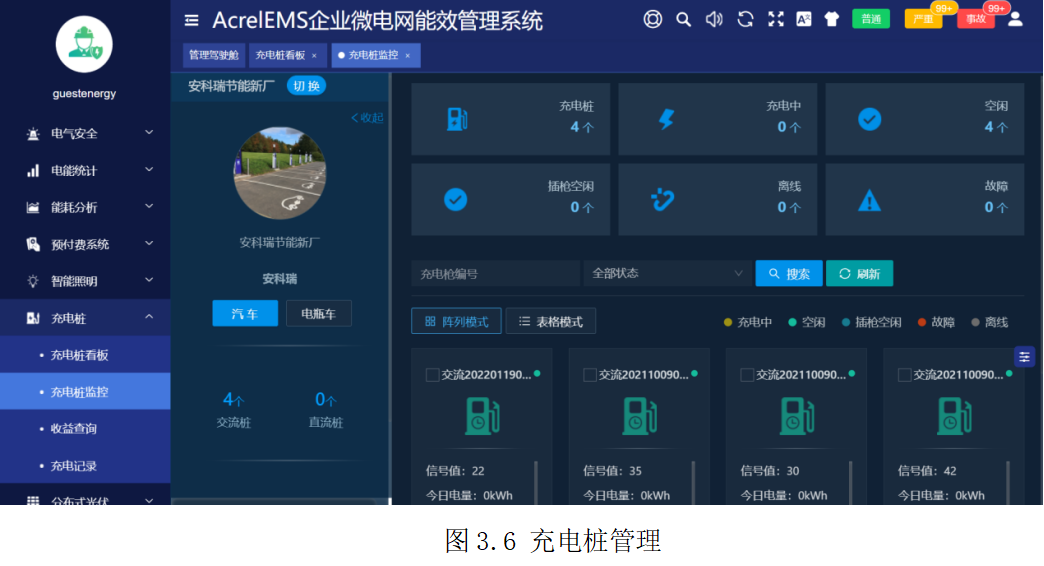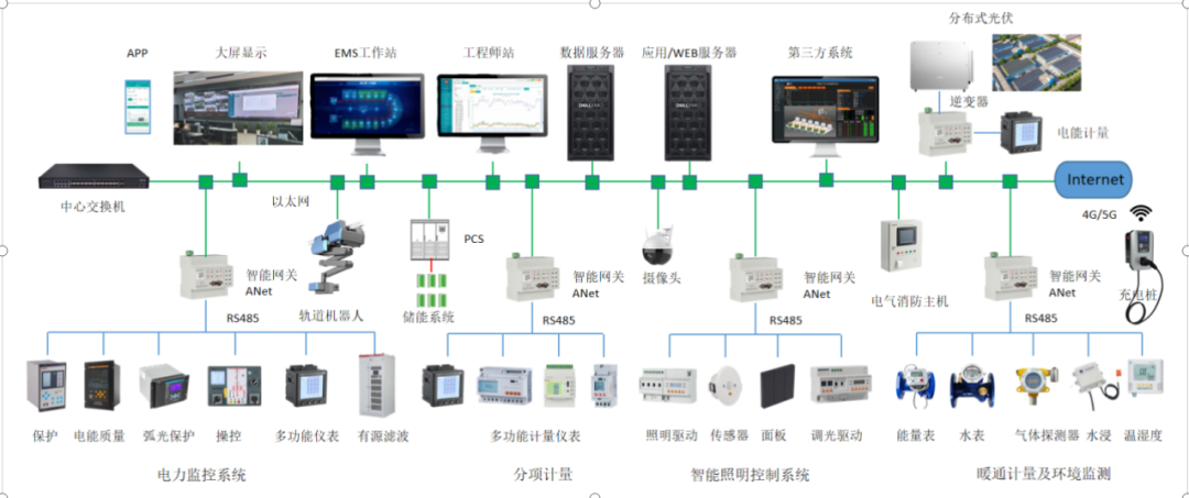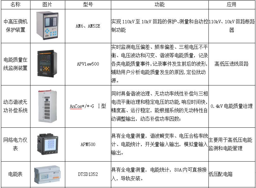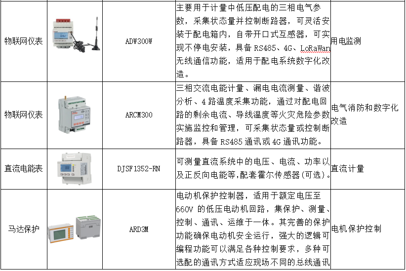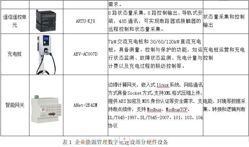 3.5 儲能管理 監(jiān)測儲能系統(tǒng)、電池管理系統(tǒng)(BMS)和儲能變流器(PCS)運行,包括運行模式、功率控制模式,功率、電壓、電流、頻率等預定值信息、儲能電池充放電電壓、電流、SOC、溫度,根據(jù)企業(yè)峰谷特點和電價波動以及上級平臺指令設置儲能系統(tǒng)的充放電策略,控制儲能系統(tǒng)充放電,實現(xiàn)削峰填谷,降低企業(yè)用電成本。 3.6 充電樁運營管理 監(jiān)測企業(yè)充電樁的運行狀態(tài),提供充電樁收費管理和狀態(tài)監(jiān)測功能,并根據(jù)企業(yè)負荷曲線和變壓器負荷率調(diào)節(jié)充電樁的充電功率,引導有序充電,使企業(yè)能源系統(tǒng)穩(wěn)定安全運行。 4 企業(yè)能源管理系統(tǒng)硬件設備 安科瑞針對企業(yè)能源管理數(shù)字化系統(tǒng)除了軟件外,還具備現(xiàn)場傳感器、智能網(wǎng)關等設備,組成了完整的“云-邊-端”數(shù)字化體系,具體包括高低壓配電綜合保護和監(jiān)測產(chǎn)品、電能質(zhì)量在線監(jiān)測裝置、電能質(zhì)量治理、照明控制、新能源充電樁、電氣消防類解決方案等,可以為企業(yè)能源管理系統(tǒng)建設提供一站式服務能力,部分設備見表1。 5 結(jié)束語 面向未來,AcrelEMS企業(yè)能源管理系統(tǒng)將結(jié)合行業(yè)特點、服務“雙碳”目標,積極利用安科瑞“云-邊-端”的產(chǎn)品體系和能源管理數(shù)字化技術(shù)積累幫助企業(yè)改造傳統(tǒng)電網(wǎng),加快推動企業(yè)用能向更加智慧、更加安全、更加友好的能源數(shù)字化升級,為促進生態(tài)文明建設作出持續(xù)貢獻。